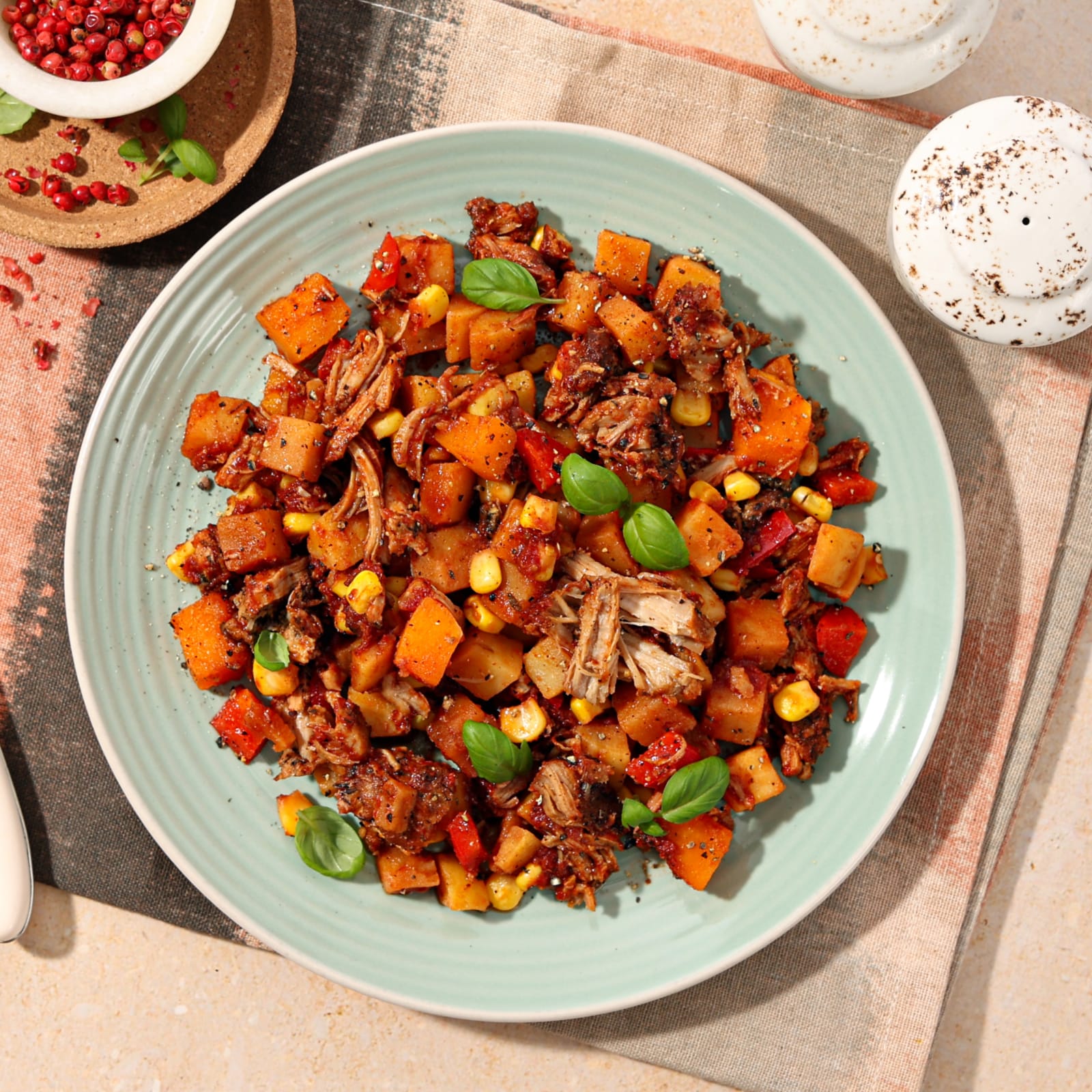 tender pulled pork in smoky BBQ sauce mixed with potatoes, sweetcorn, red pepper, and butternut squash for a tasty, fuss-free meal!