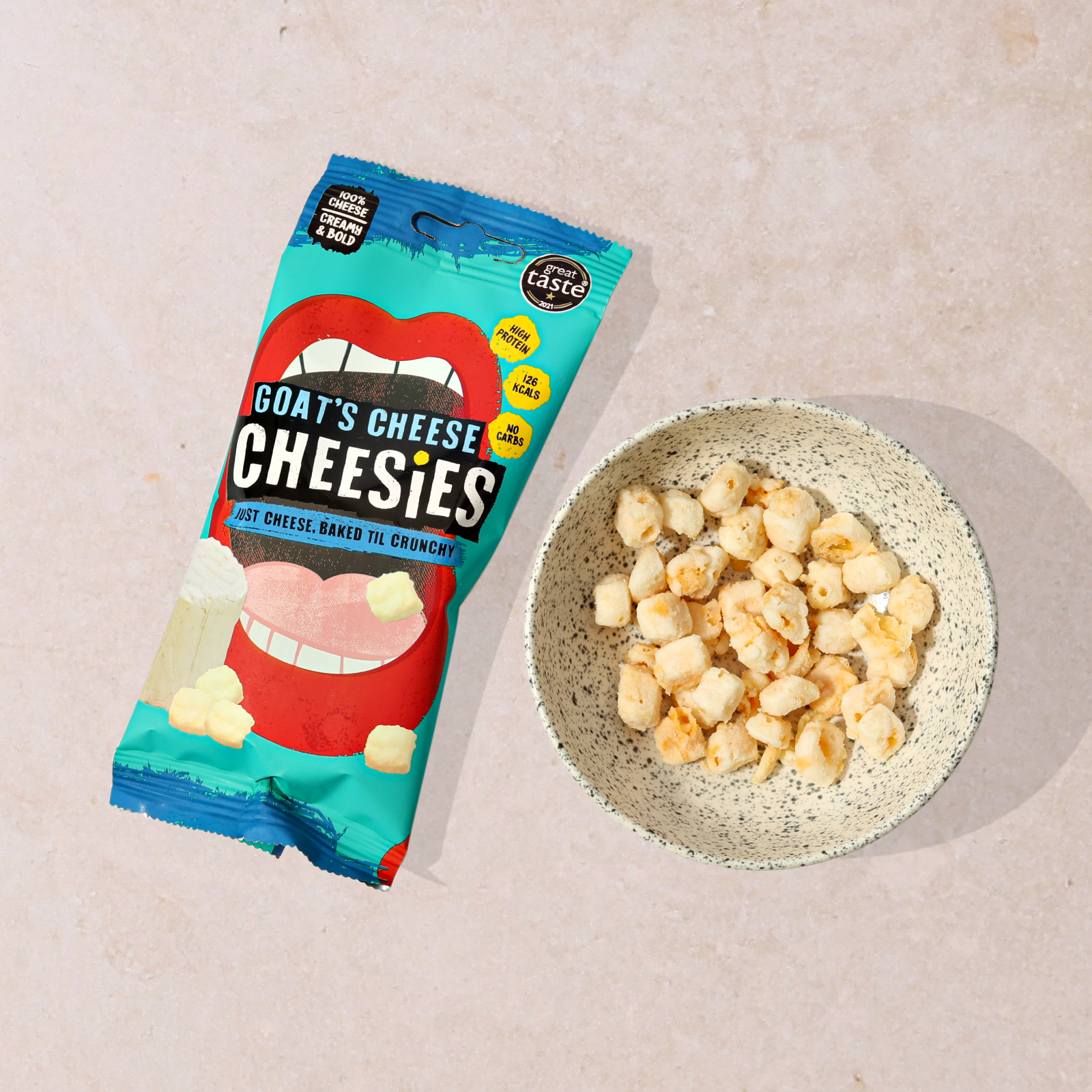 Tangy, creamy, and seriously moreish – Cheesies are made from 100% goat’s cheese and nothing else. Baked until perfectly crisp, they’re high in protein, with zero sugar and zero carbs. Pure goat’s cheese, reimagined as a crunchy snack.