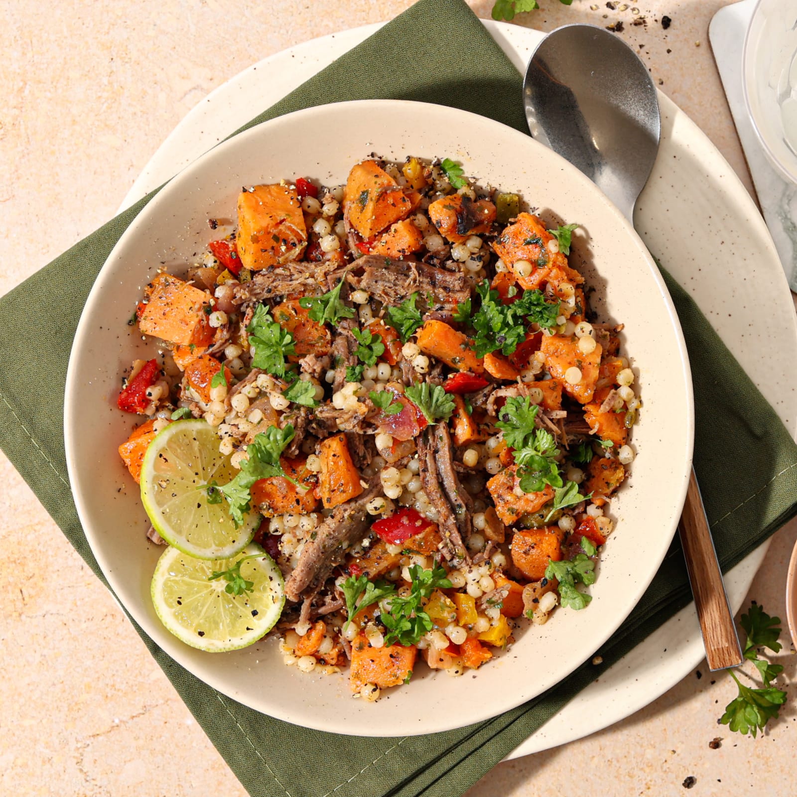 Spicy shredded beef brisket with roasted sweet potatoes, giant cous cous and chimichurri dressing.