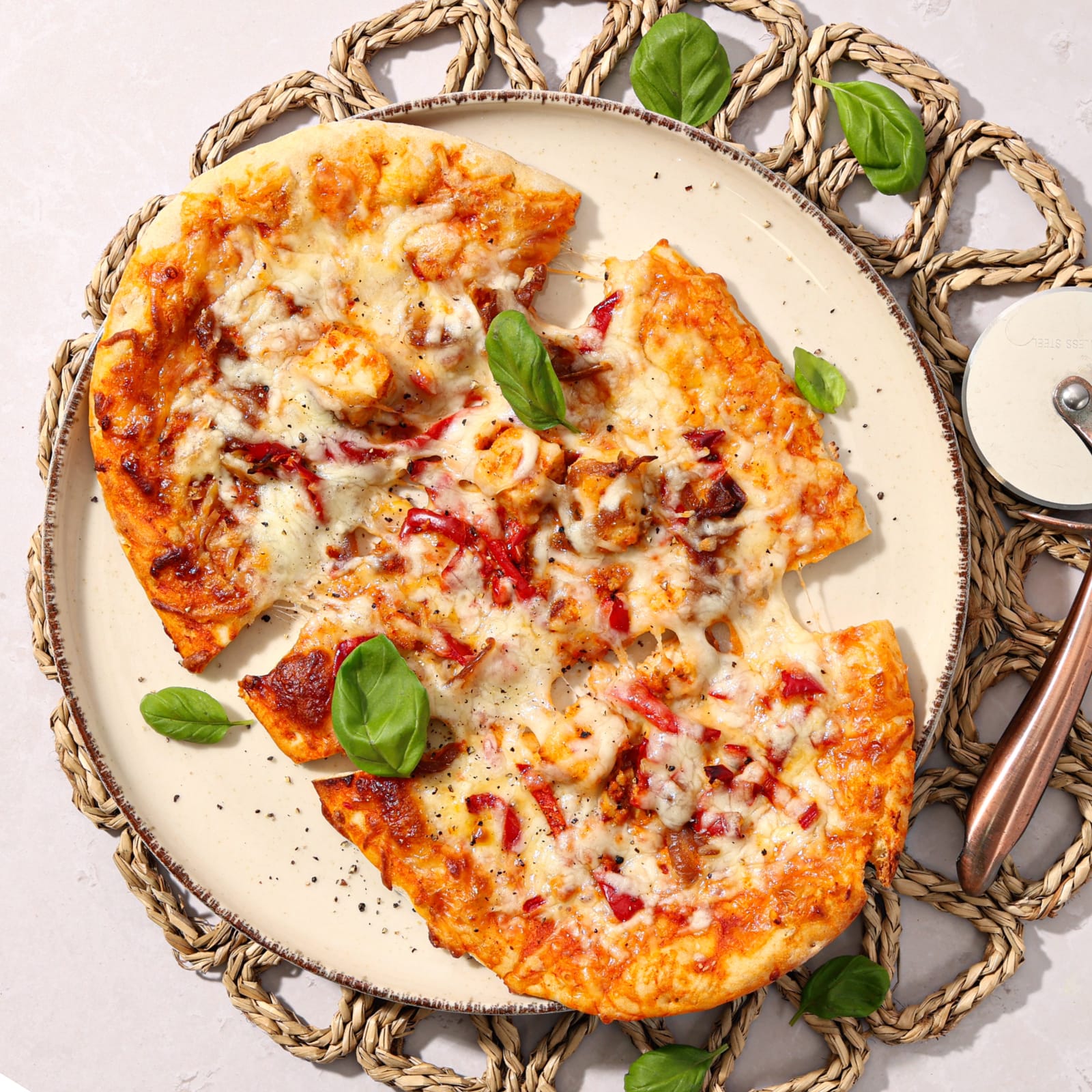 stonebaked sourdough base packed with pea protein, topped with spicy buffalo chicken, melty mozzarella, red onion, and rich tomato sauce