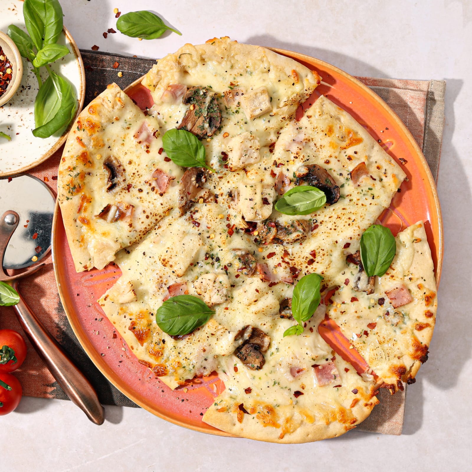 Stonebaked sourdough pizza, topped with carbonara sauce, mozzarella cheese, chicken breast, garlic mushrooms, and smoky ham.