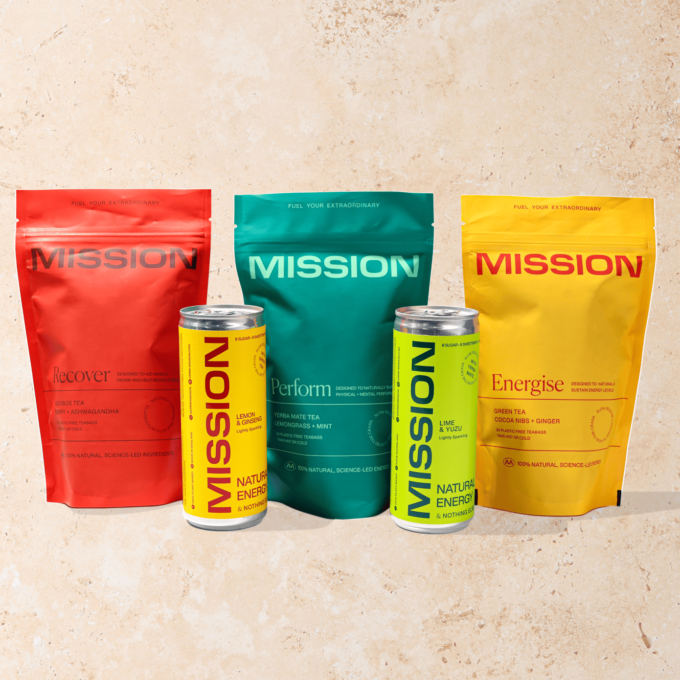 The complete Mission bundle, Preform, Energise and Recover tea plus one can of each of their natural energy cans.