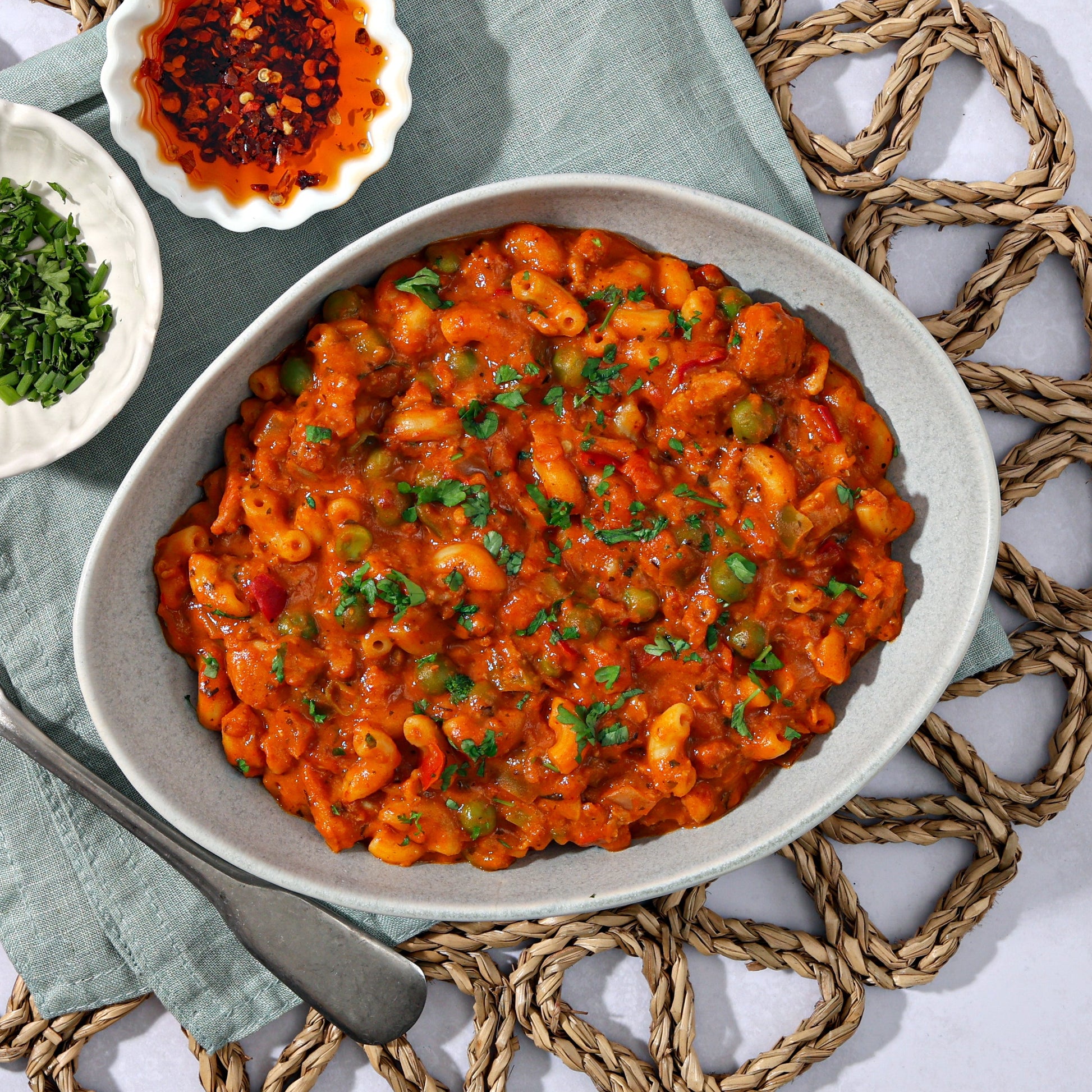 Tantalising marinated chicken pairs perfectly with creamy spiced pasta and peas.